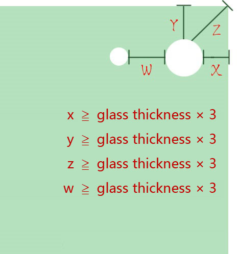 Since the basic application functions of glass are mostly related to buildings or furniture, it is inevitable that there will be a need for drilling through the glass. However, it is necessary to pay attention to the relative position of the hole to the size of the glass when drilling, so as not to excessively damage the characteristics of the glass itself, which may affect the safety or the control of the extension of the edge caused by the drilling. If there is a demand for glass drilling, it is recommended to refer to the optimum processing conditions indicated in the figure below.