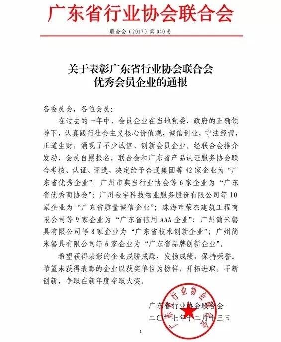 在廣東省行業(yè)協(xié)會聯(lián)合會2017年度盛典上,分別表彰了“廣東省優(yōu)秀企業(yè)”42家、“廣東省優(yōu)秀商協(xié)會”6家、“廣東省質(zhì)量誠信企業(yè)”10家、“廣東省信用AAA企業(yè)”9家、“廣東省技術(shù)創(chuàng)新企業(yè)”8家、“廣東省品牌創(chuàng)新企業(yè)”6家。